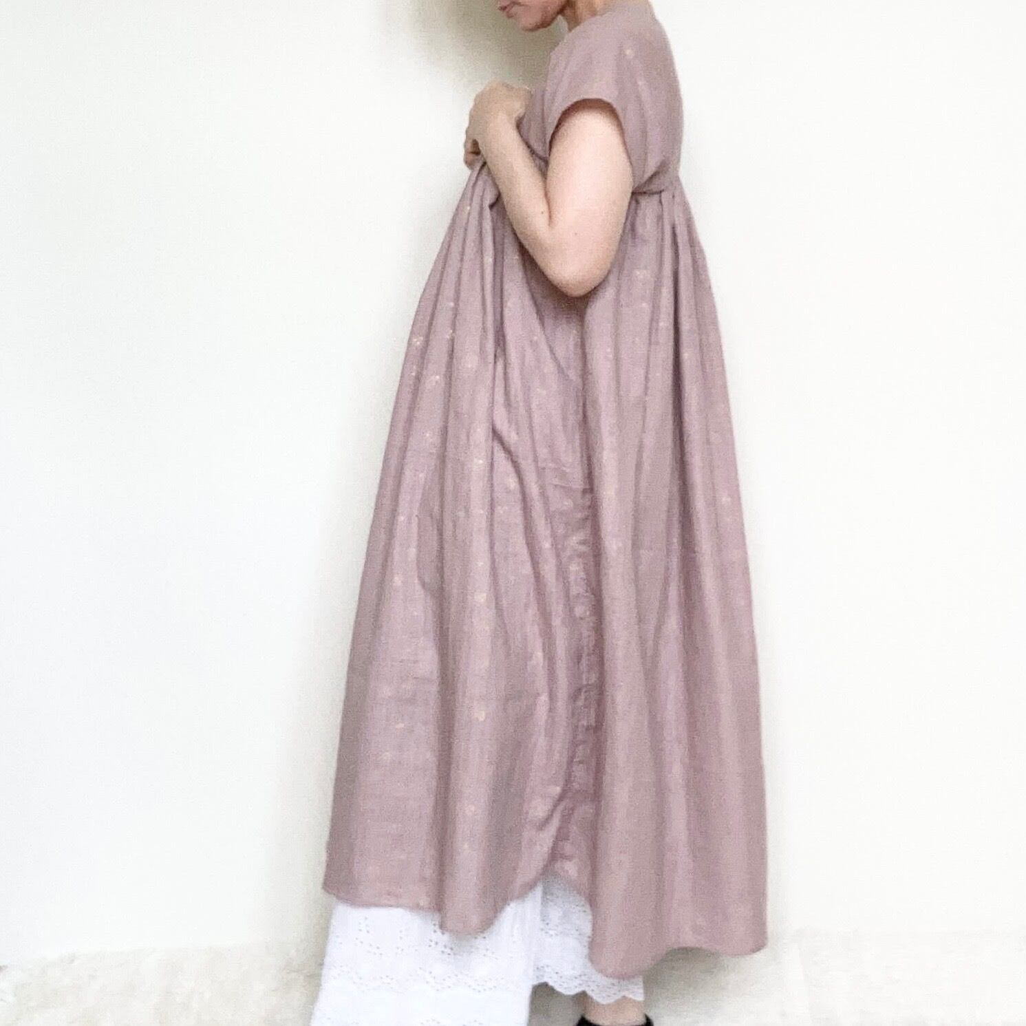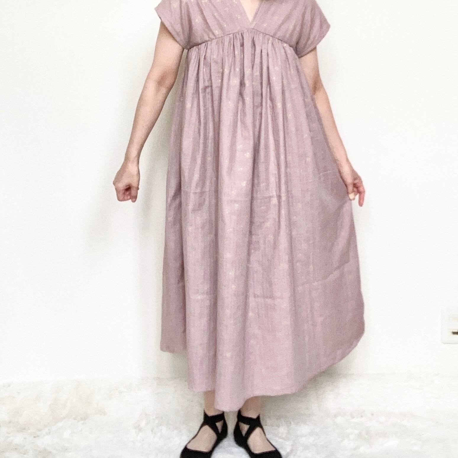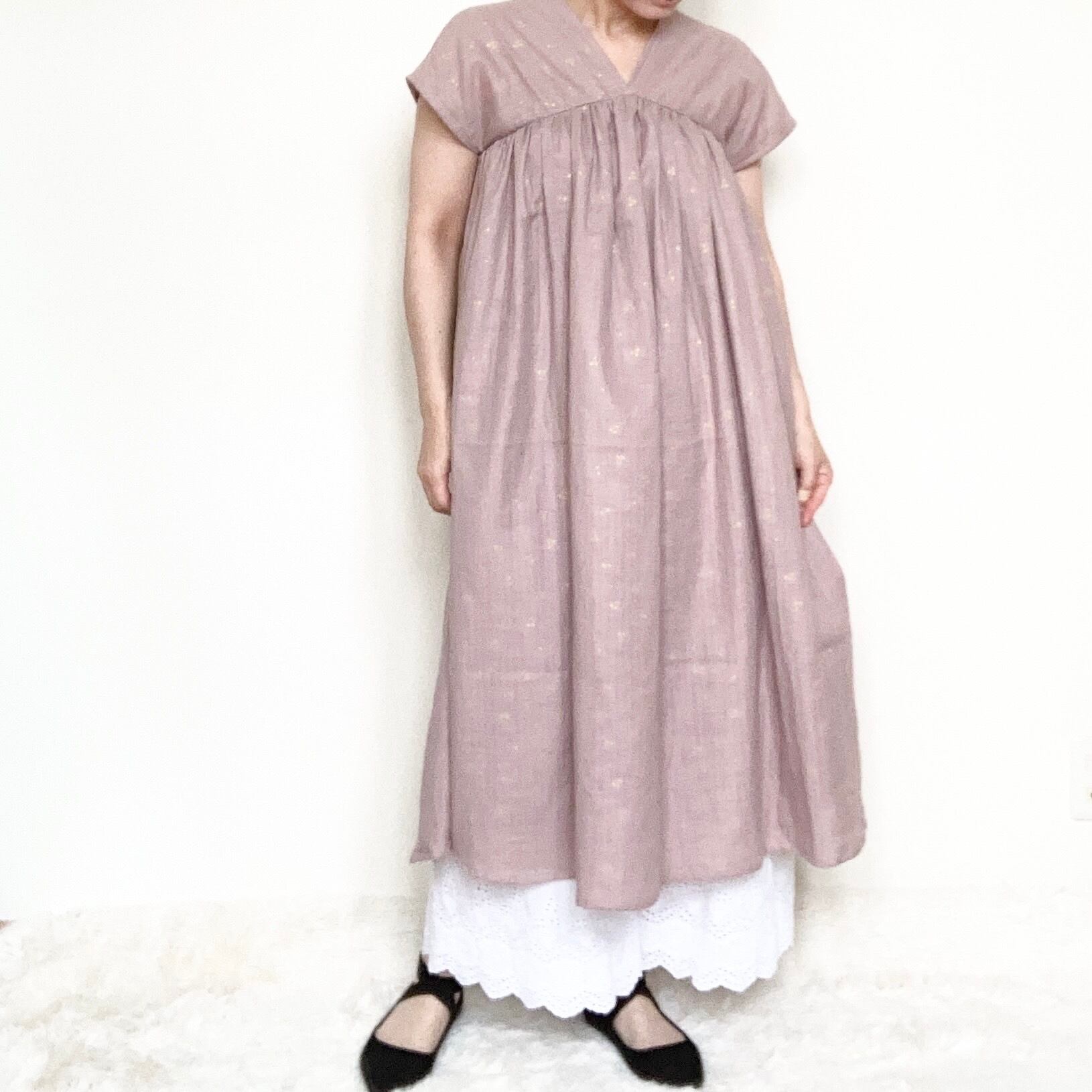 スモークピンクのコットン生地に小さな金色のさくらんぼ フレアーたっぷりに作ったワンピースは部屋着にもちょっとした外出にもお使いいただけます