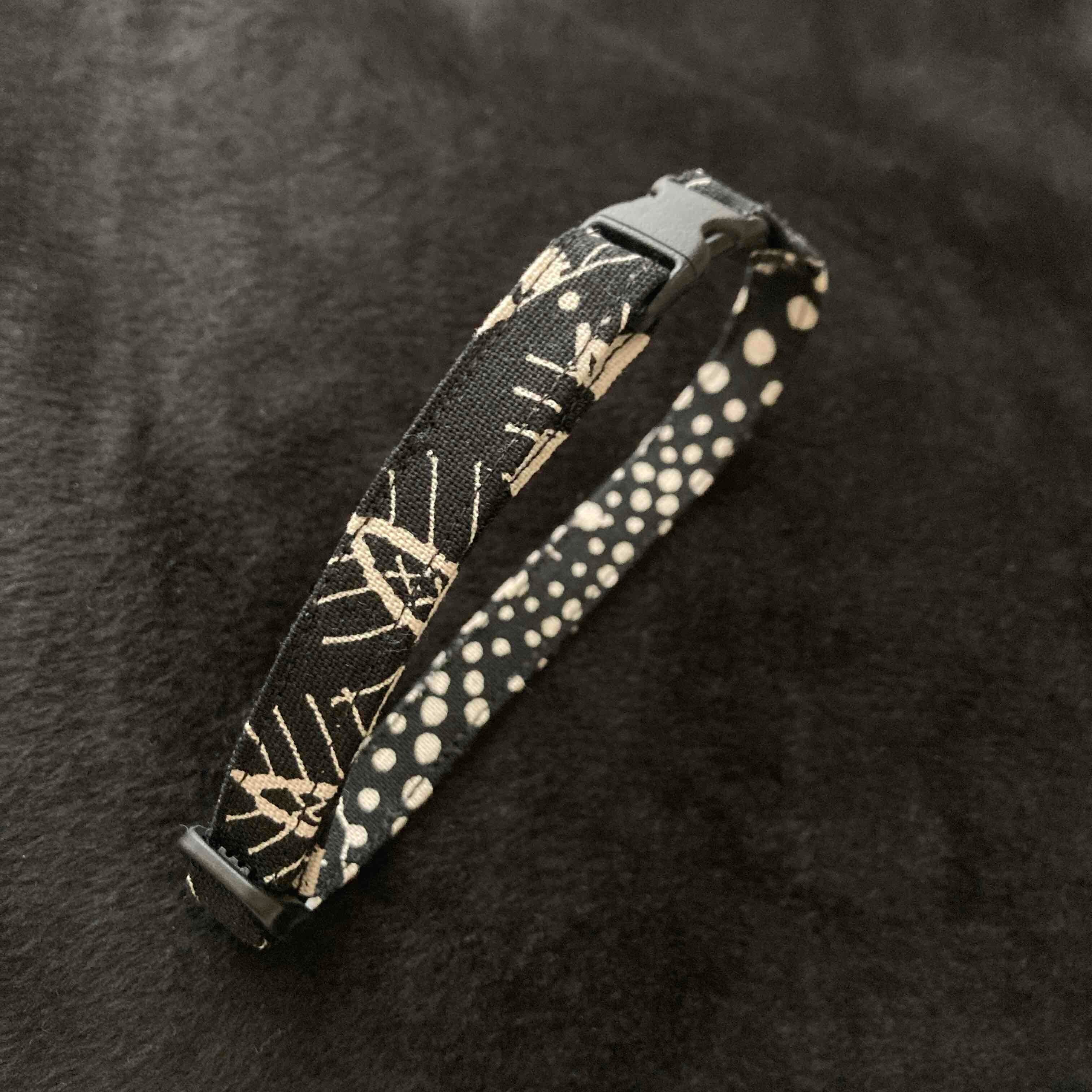 柔らかいコットン生地で作った猫用の首輪です。 高さ:1㎝ 首周り:20~31cm パーツはアメリカDuraflex社の製品を使用。 猫用に作られたBreak-awayバックルは力が加わると外れるので、万が一首輪が何かに引っ掛かってしまったときに外れやすくなっています。 *引っ張ると外れますのでリードを付けてお散歩をする場合はご使用にならないでください。