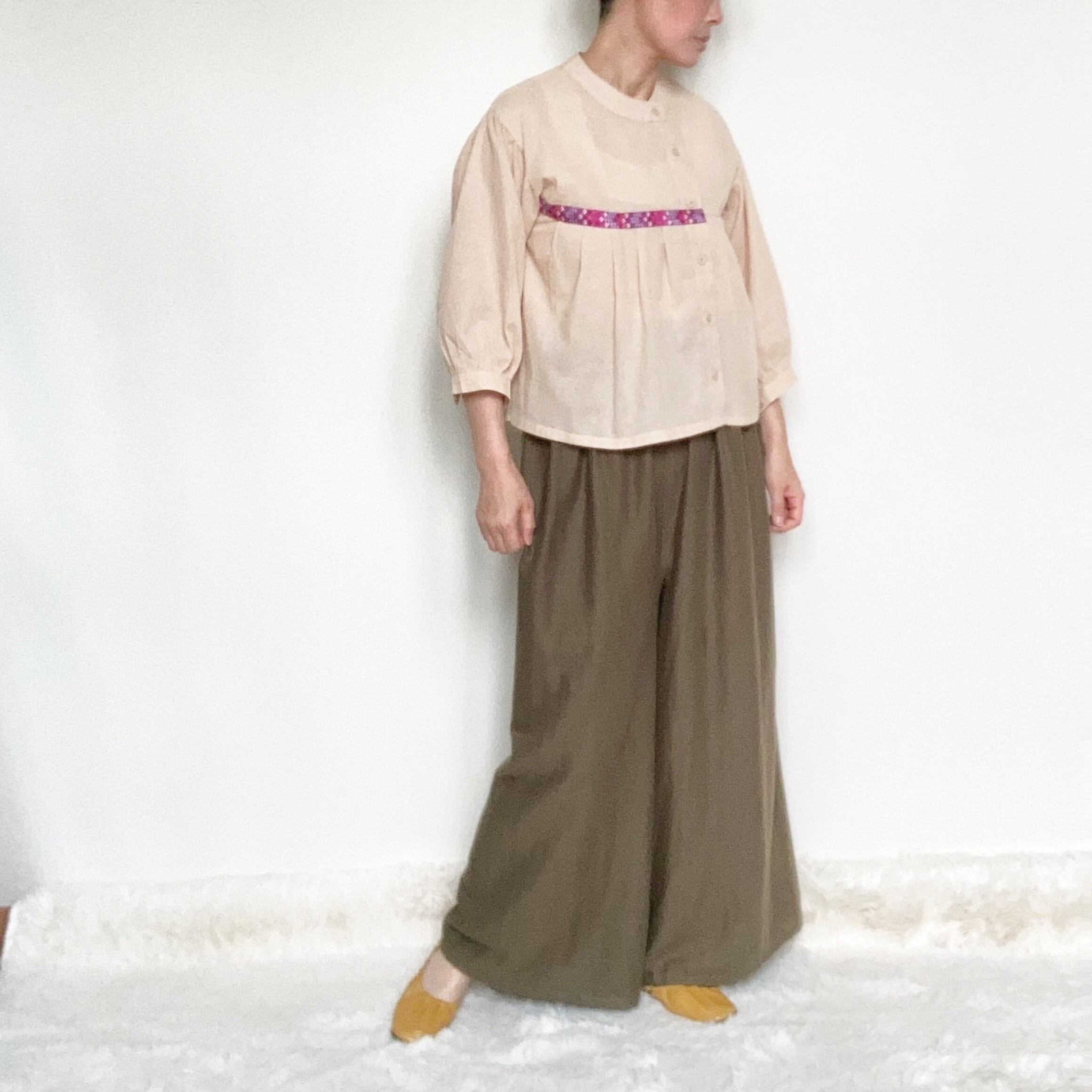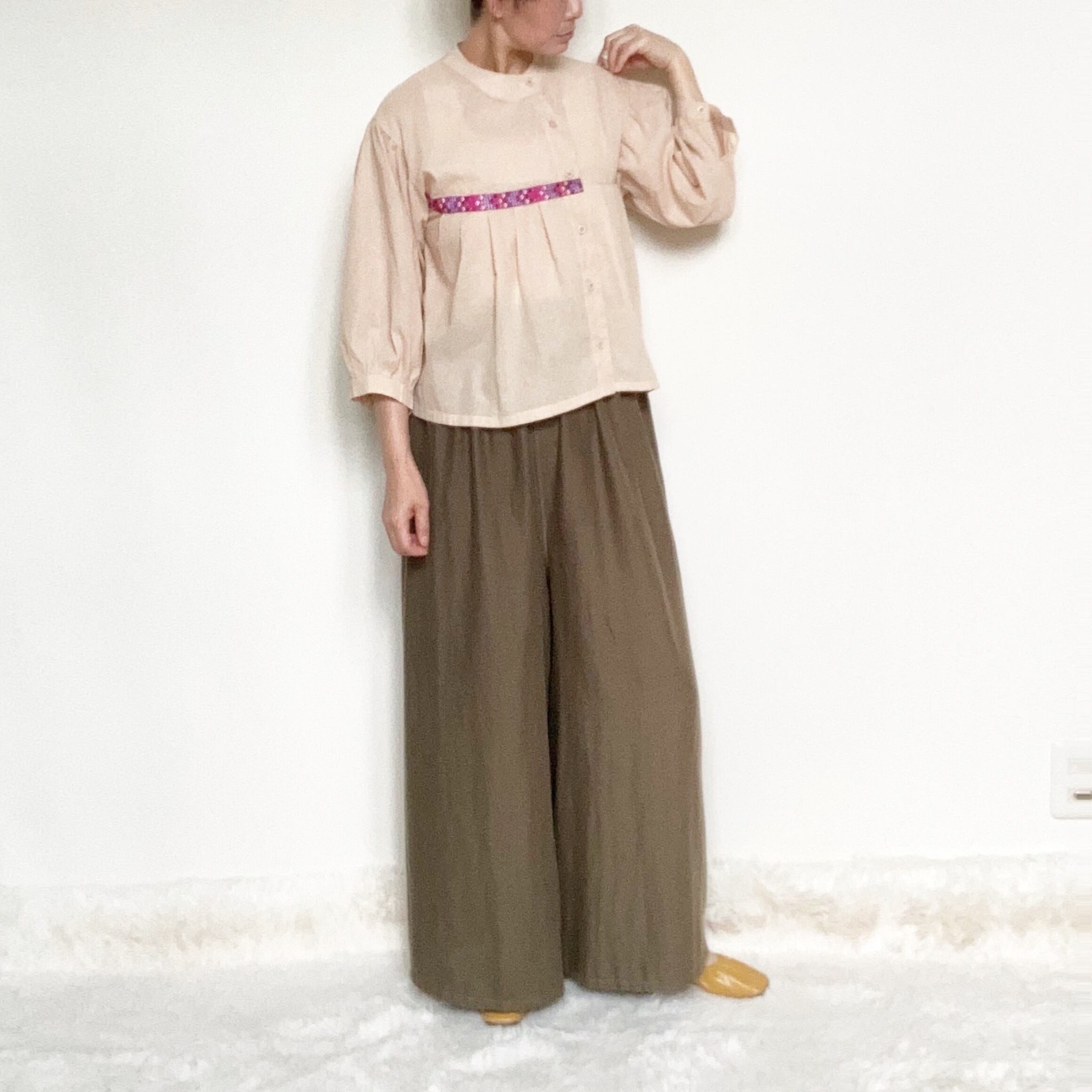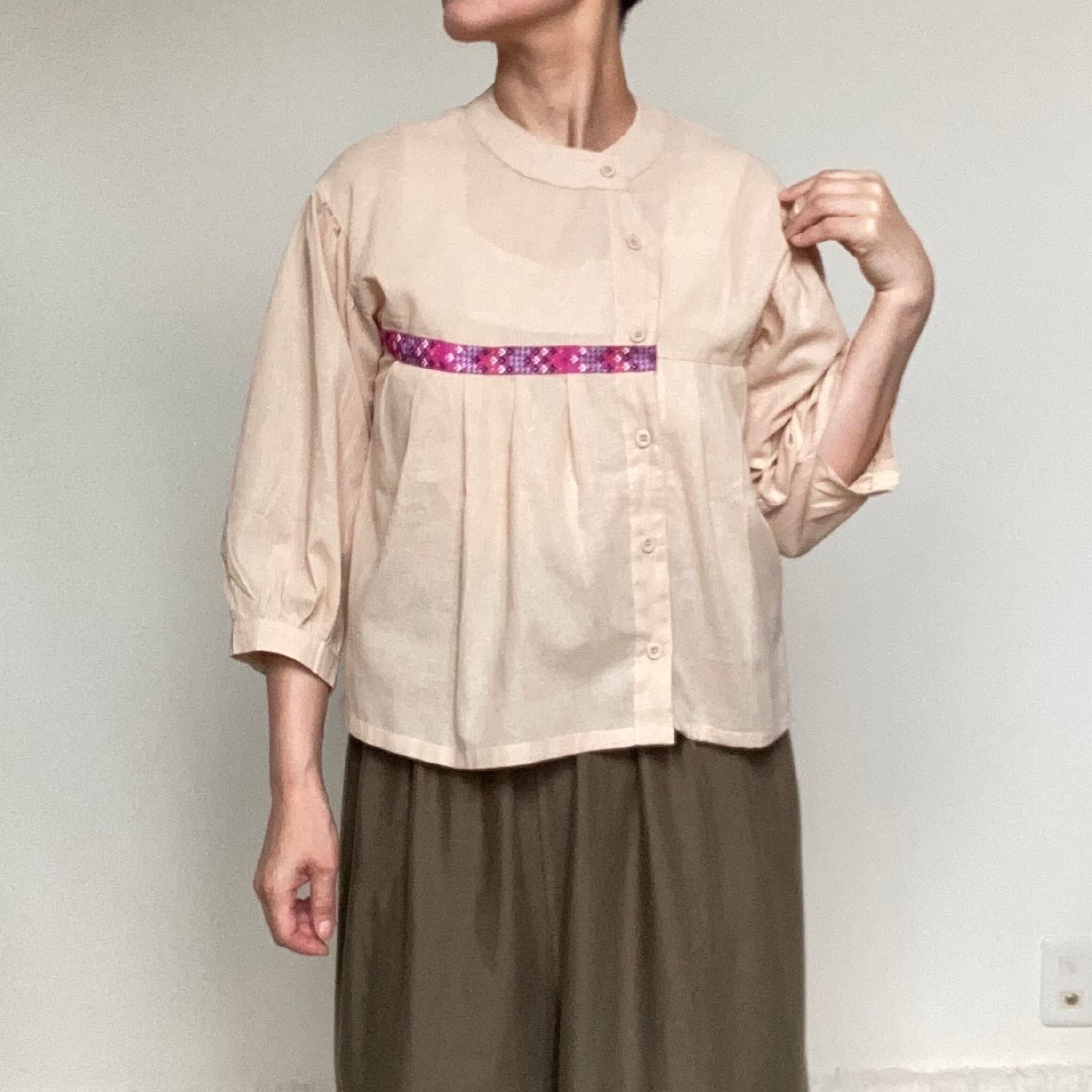 シンプルなシャツに個性的なかわいい柄のリボンを縫い付け大人かわいくリメイクしました