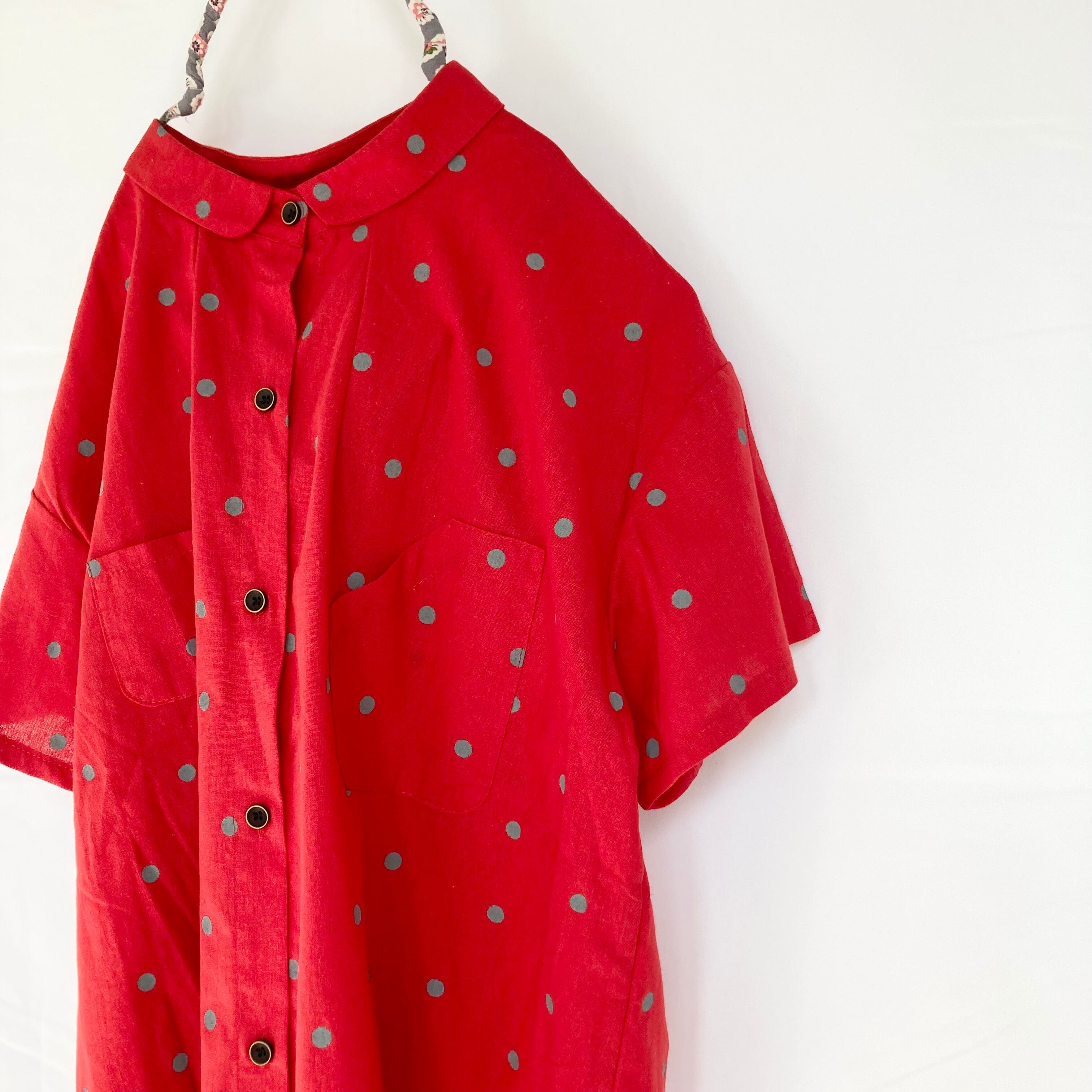 鮮やかな赤にグレーのドット柄の半袖シャツ