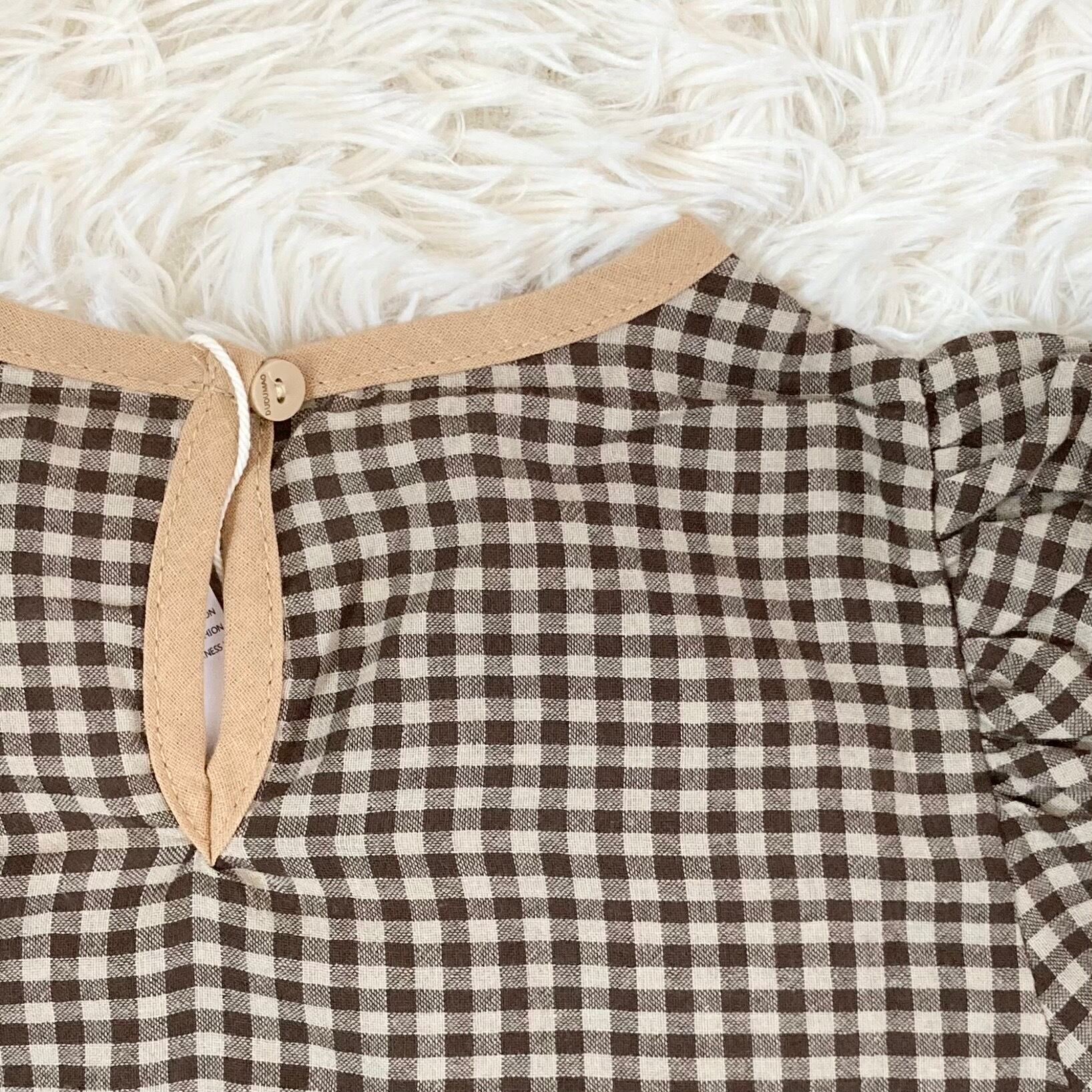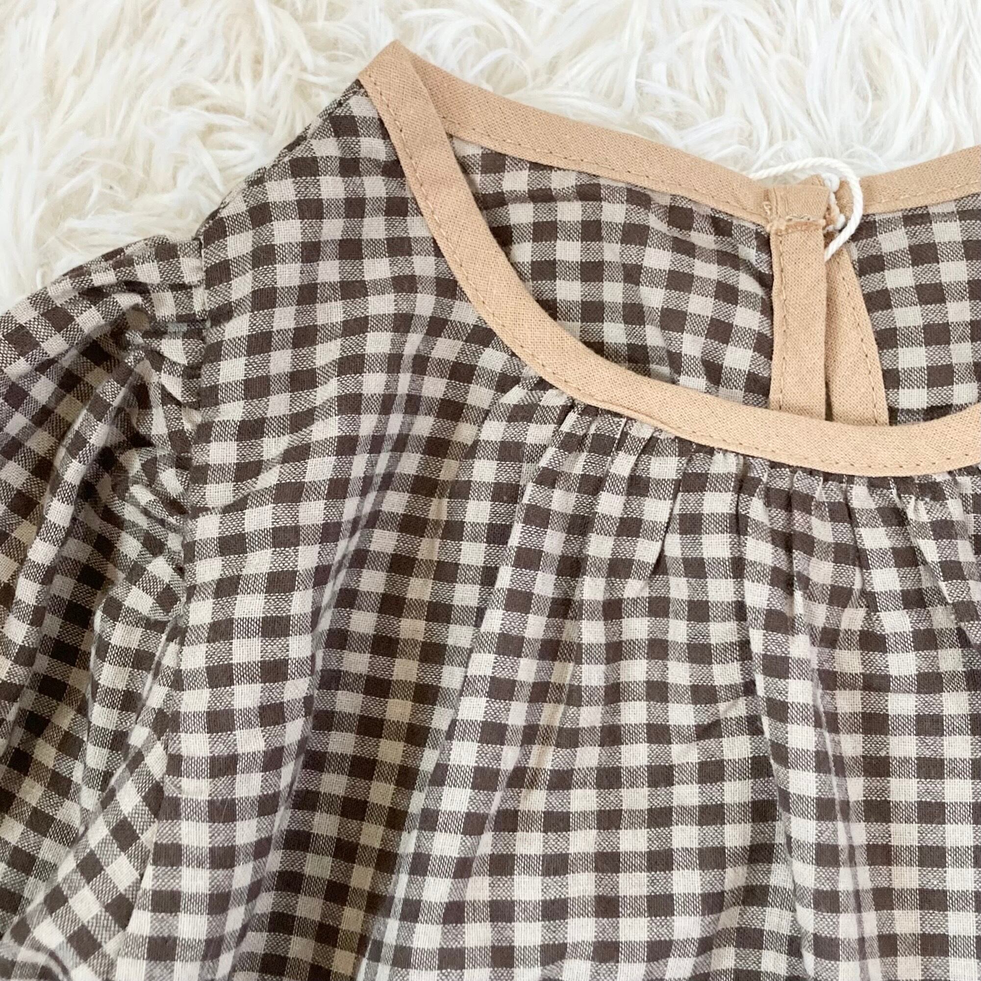 -color ブラウン・生成り -size kids 110~120サイズ -material 綿 100% -feature 長袖・トップス・チェック・ギャザー *がんばルームウエアはリメイク代・送料・税・寄付金が含まれた価格です* *サイズを必ずご確認ください*