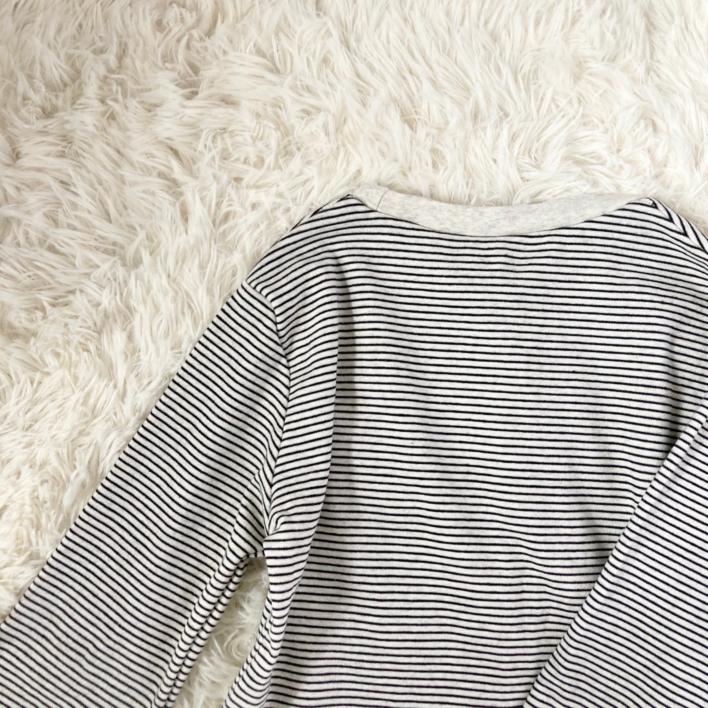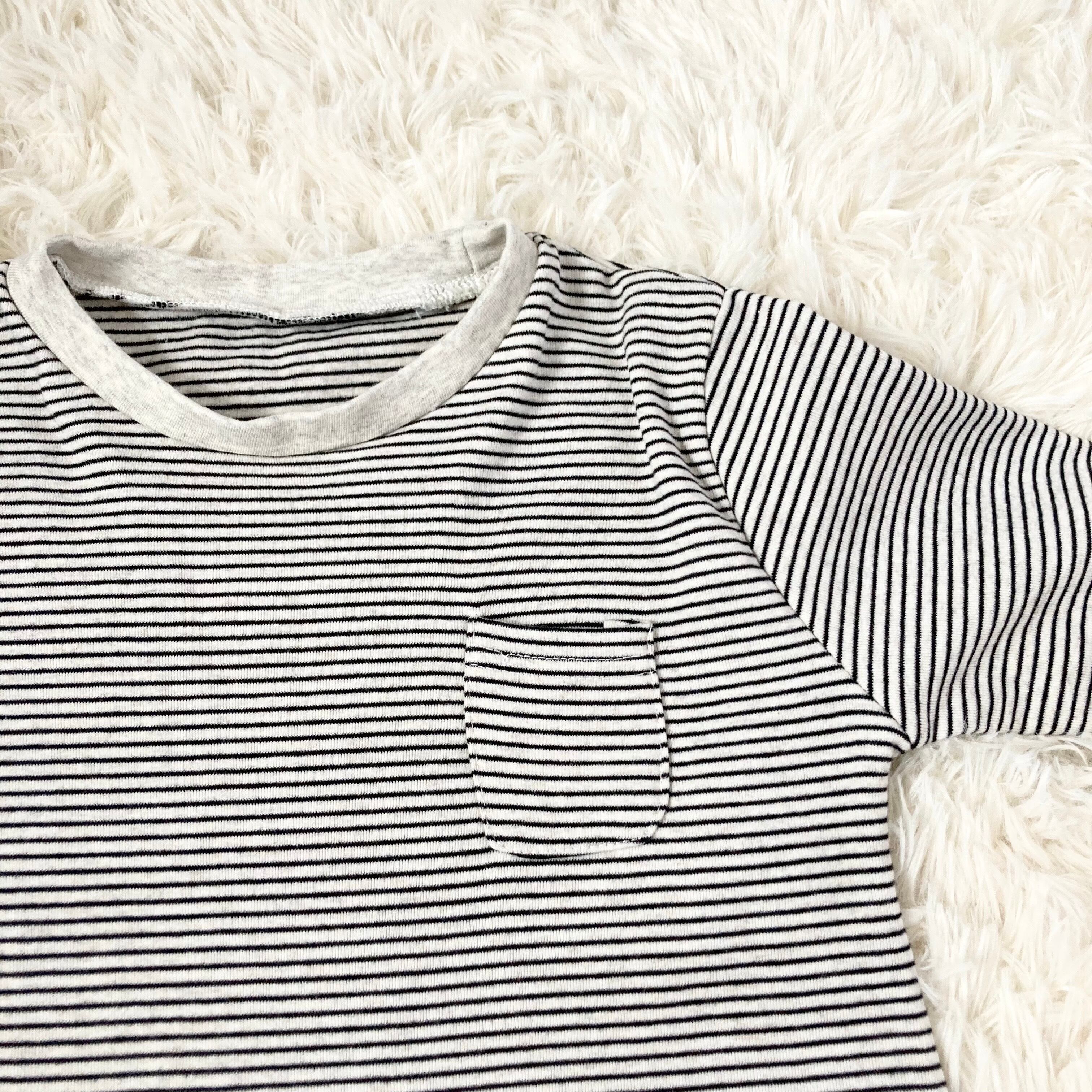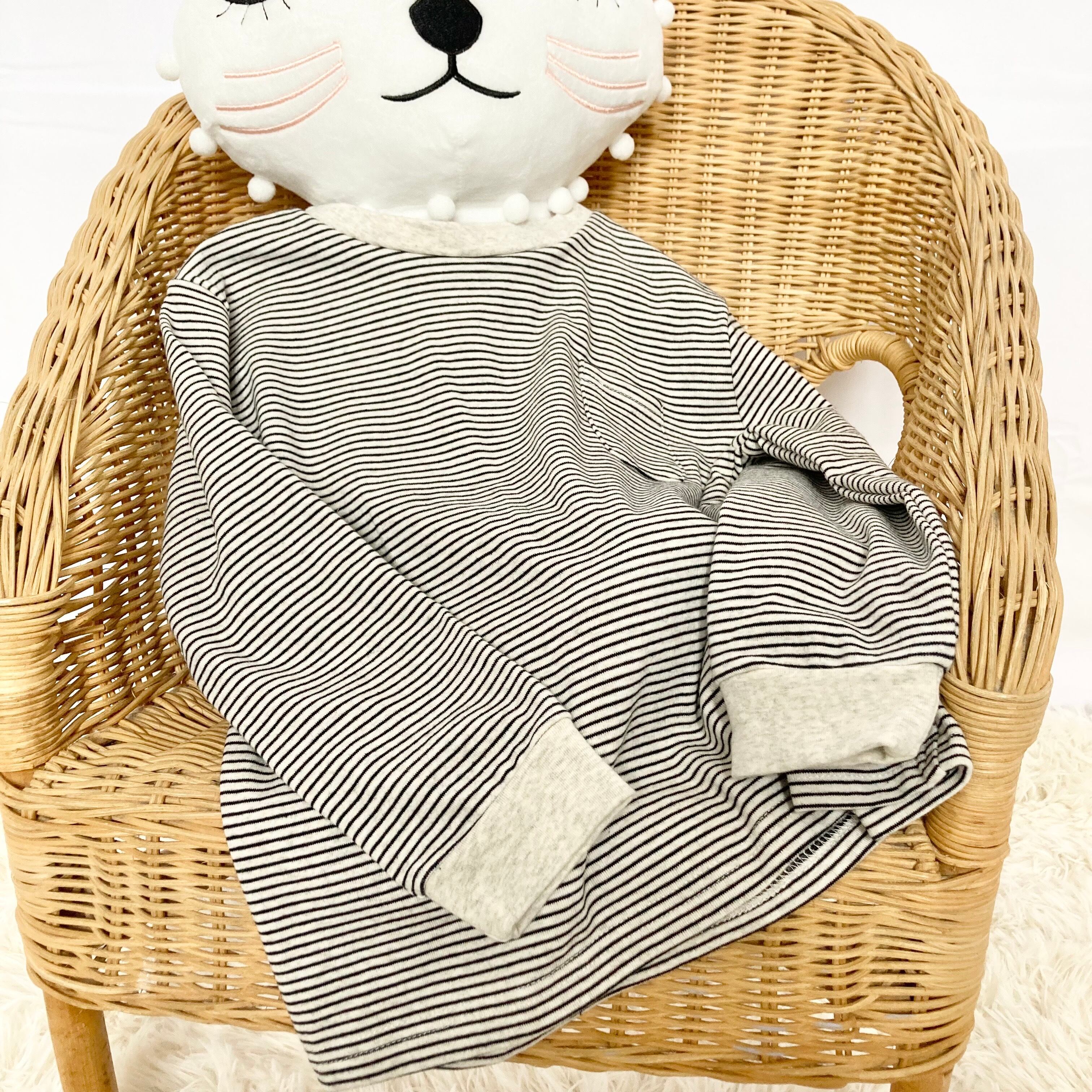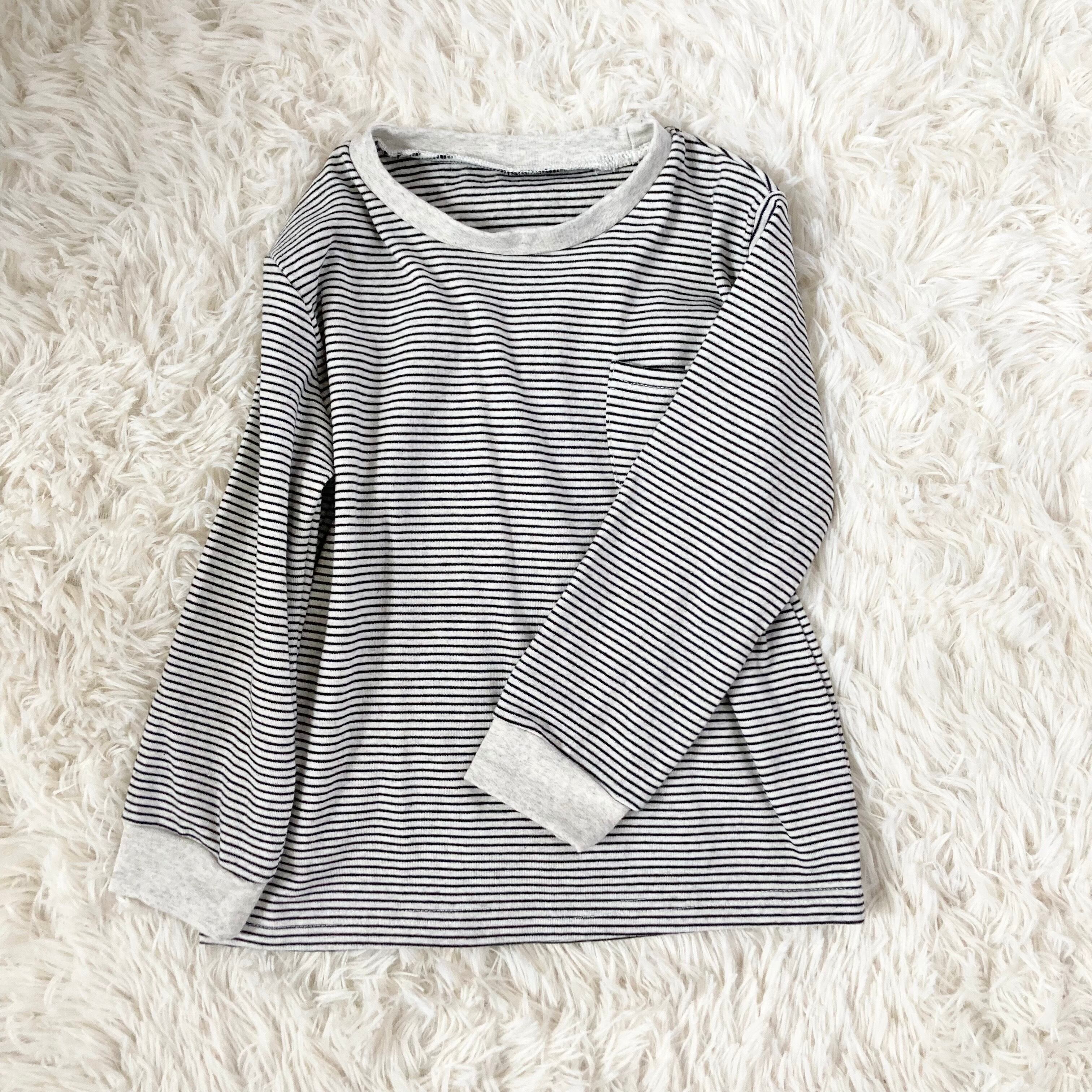 -color グレー・生成り -size 110サイズ -material 綿 100% -feature 長袖・トップス・あったか・ストライプ *がんばルームウエアはリメイク代・送料・税・寄付金が含まれた価格です* *サイズを必ずご確認ください*
