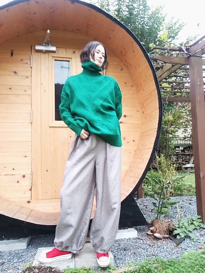 -feature 春夏秋冬・ウエストゴム・グレードット・艶のある生地
