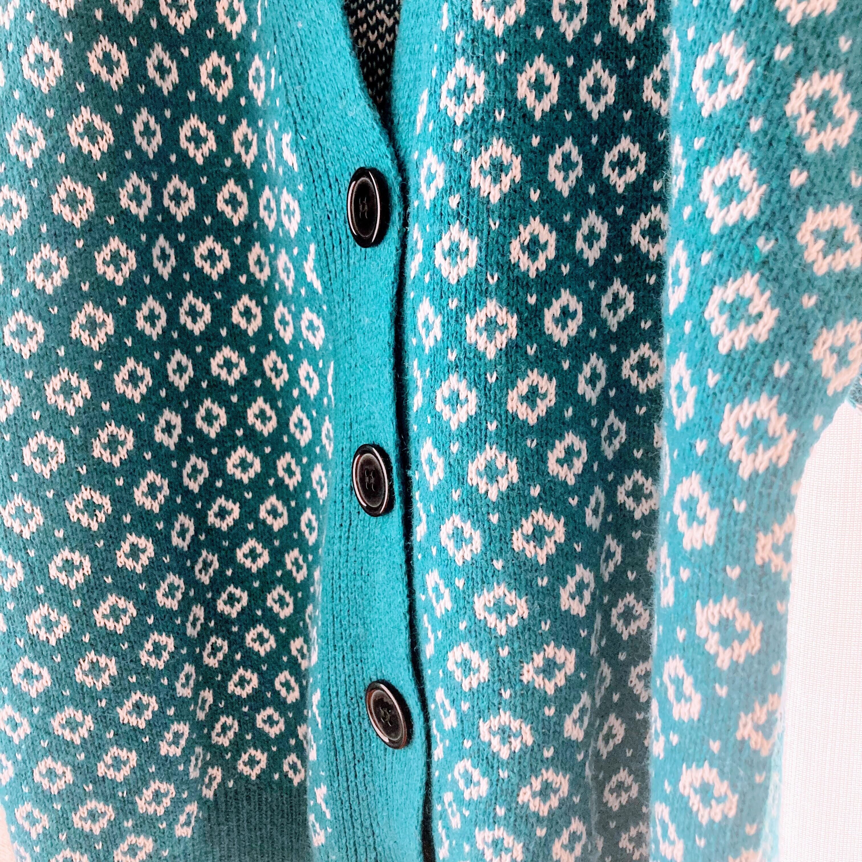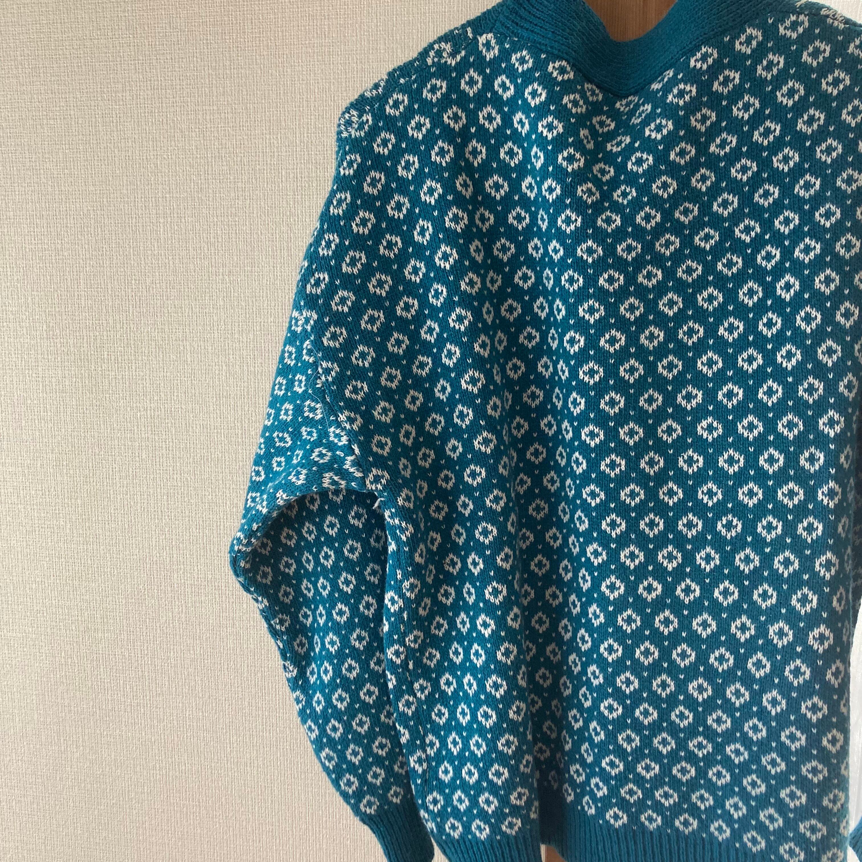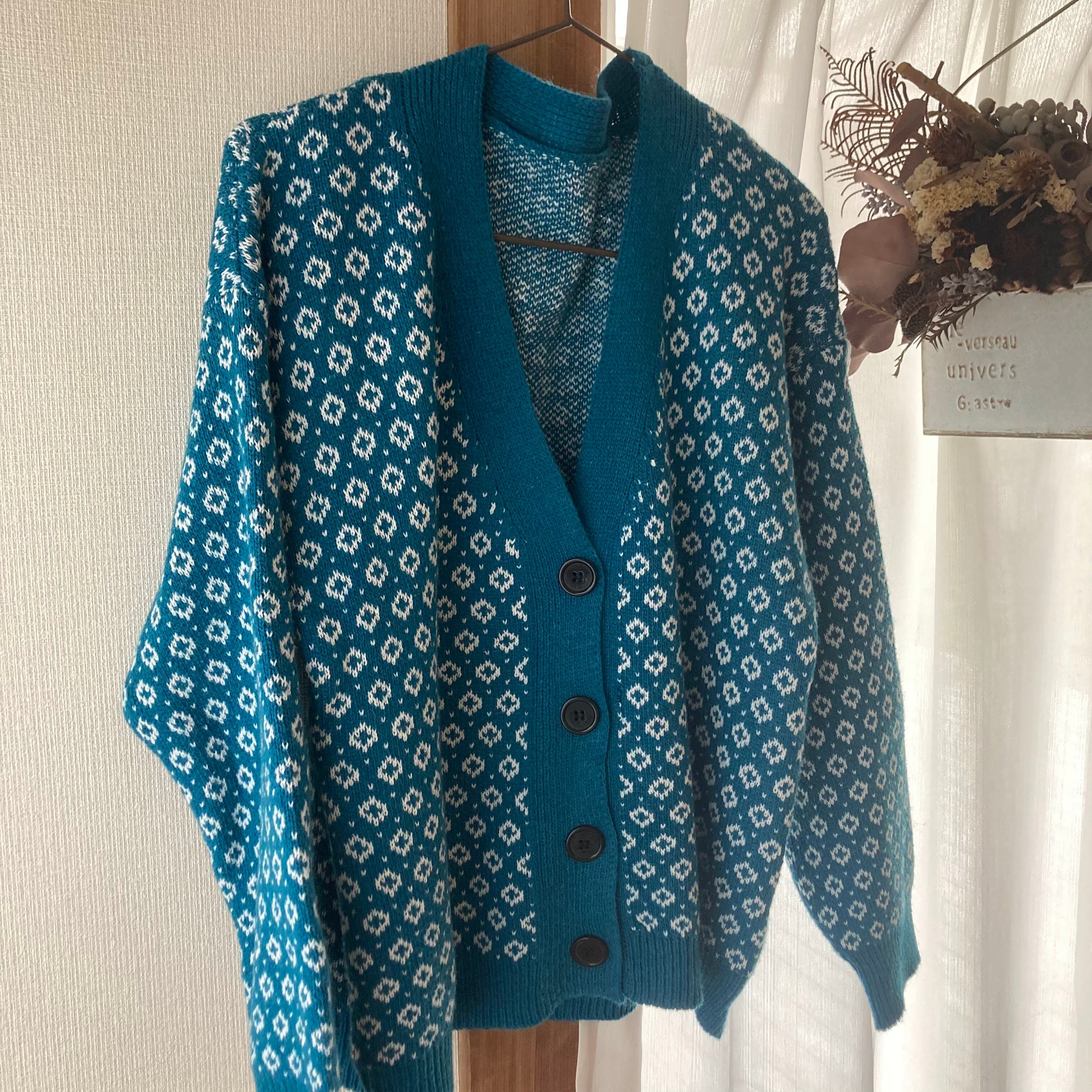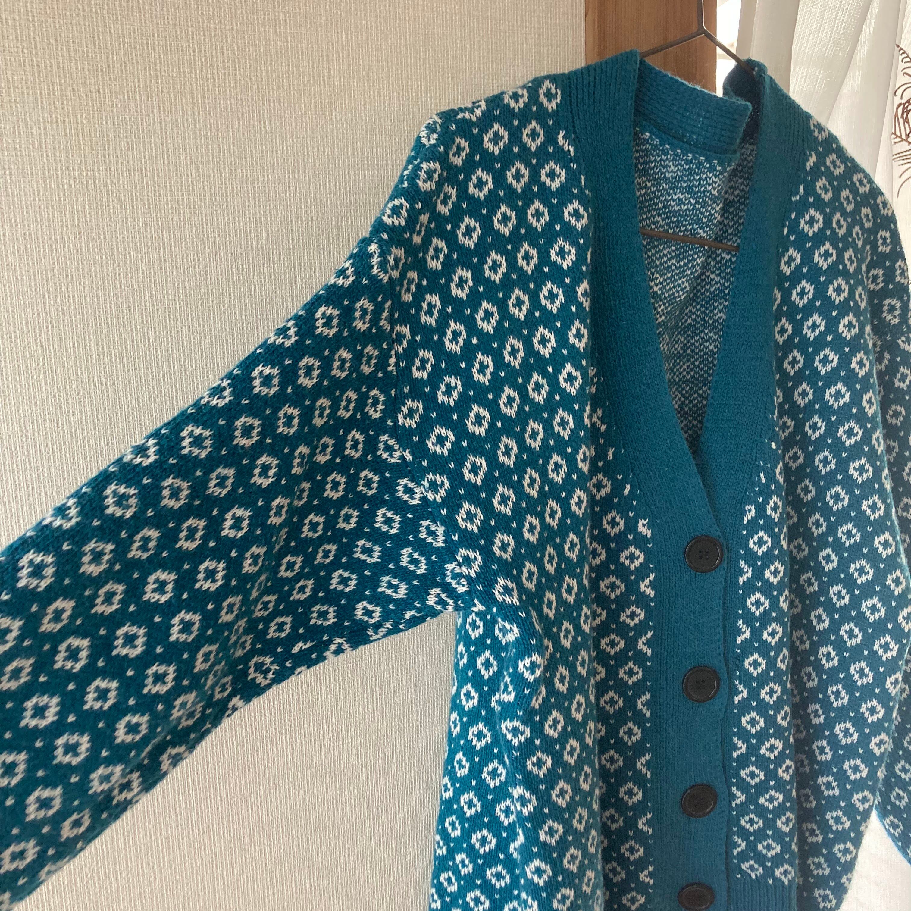-feature 水色・ダイヤ柄・厚手カーディガン
