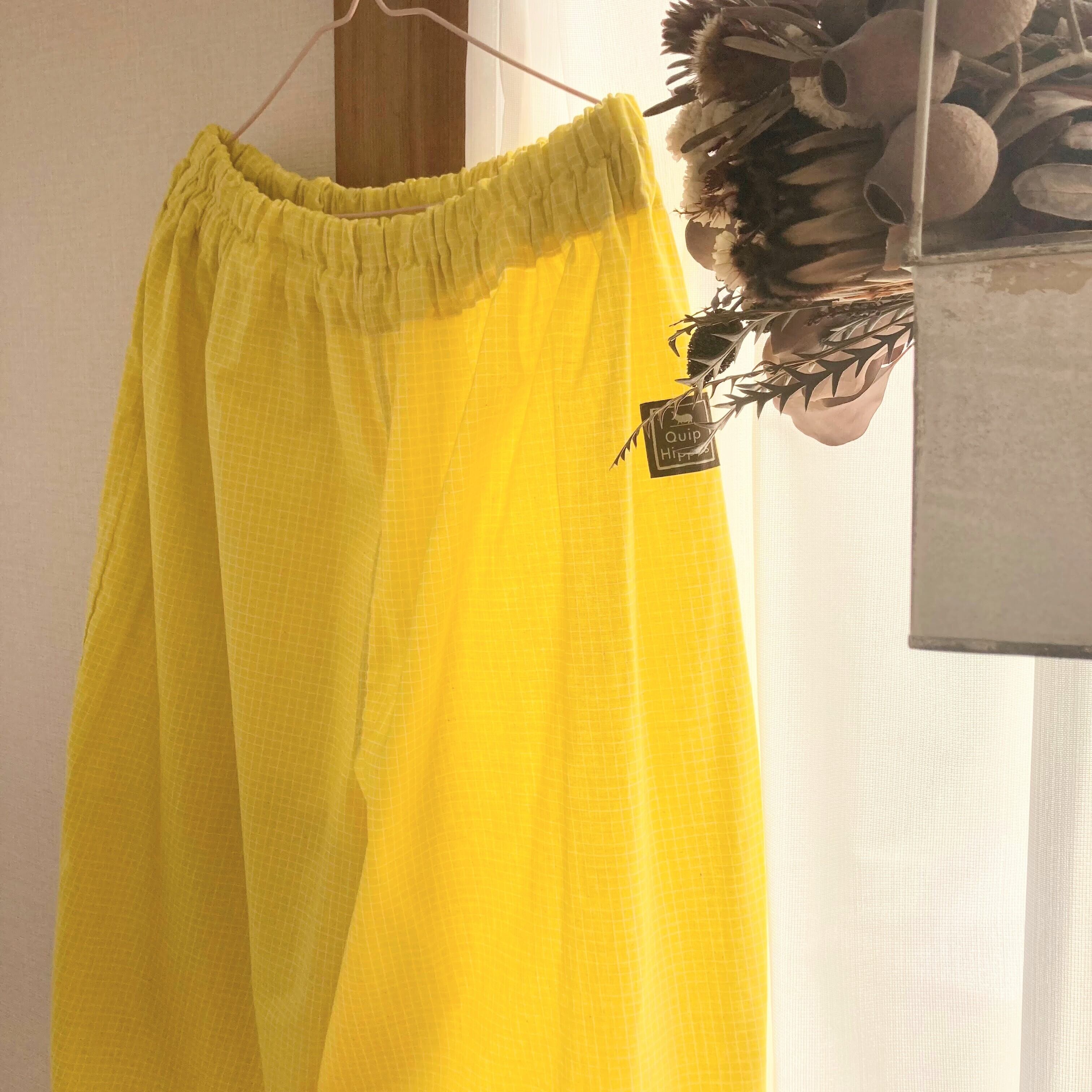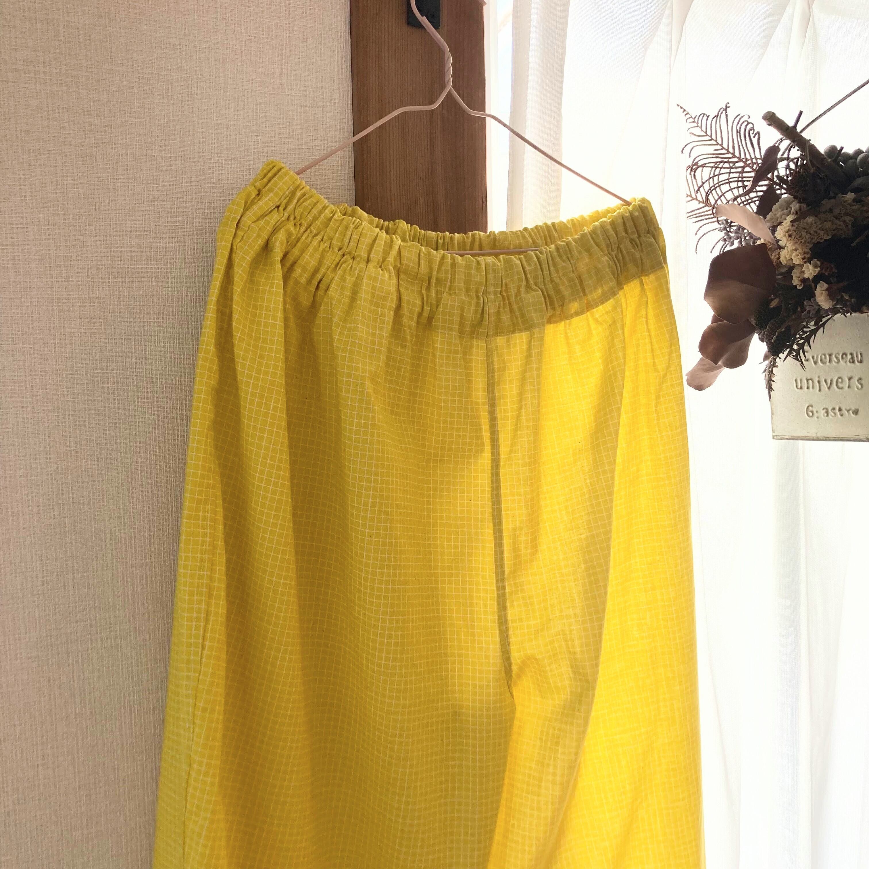 -feature イエローグレー・チェック柄・ウエストゴム・ゆったり・春夏秋